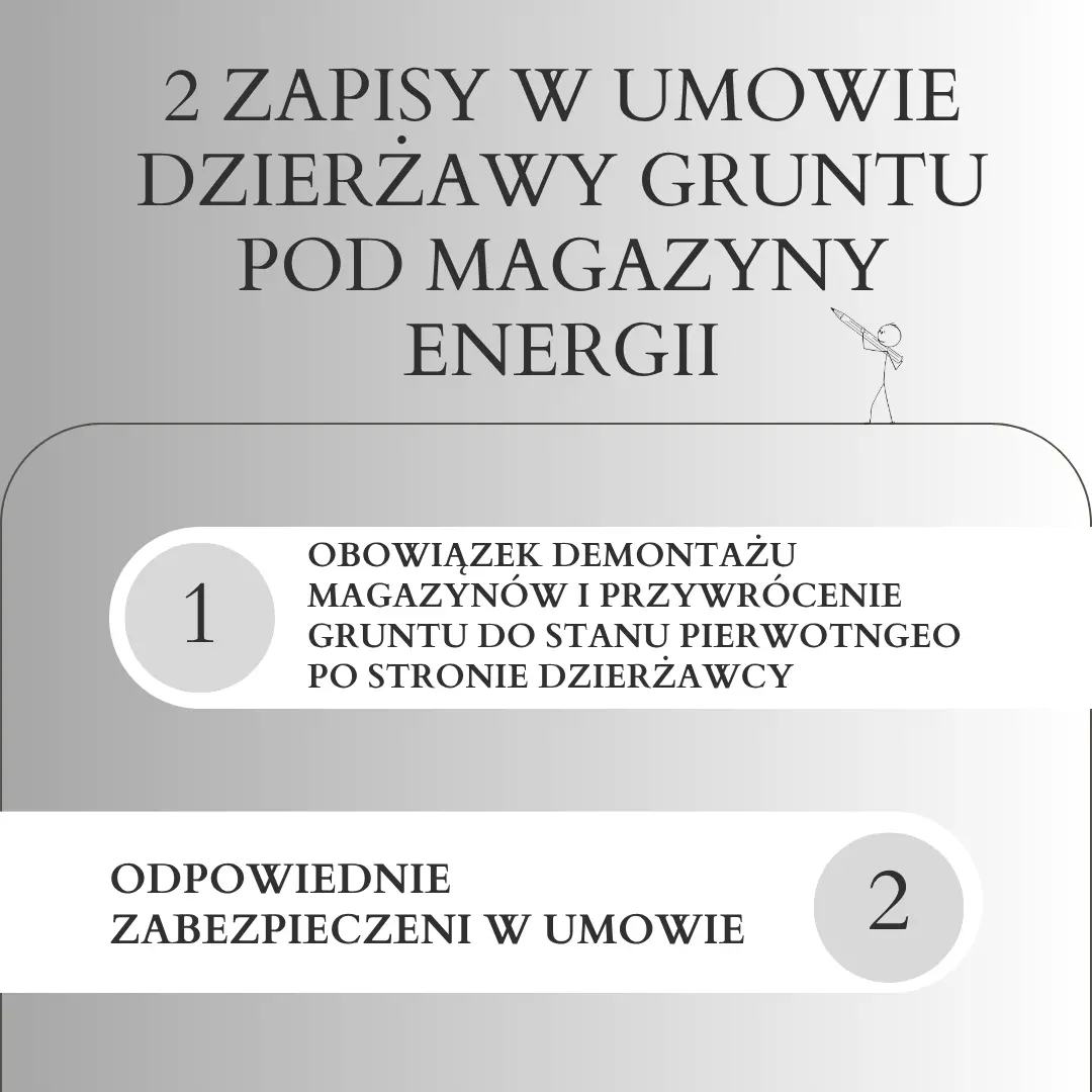 - 📝 Na pewno trzeba zawrzeć w umowie dzierżawy zapisy, które zapewnią, że obowiązek demontażu magazynów energii i przywrócenia gruntu do stanu pierwotnego będzie leżeć wyłącznie po stronie Dzierżawcy.