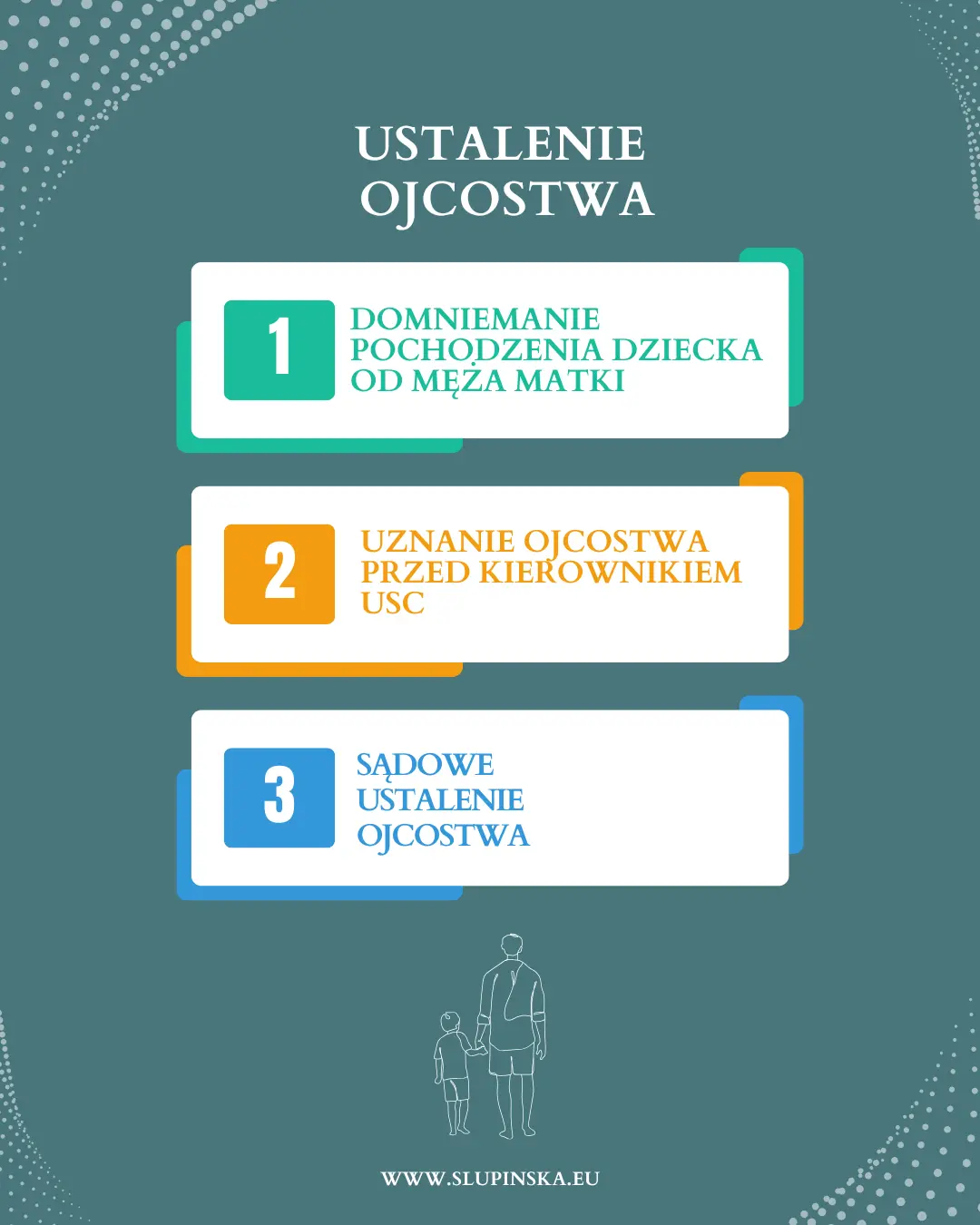 - Sądowe ustalenie ojcostwa – gdy nie obowiązuje domniemanie pochodzenia dziecka z małżeństwa i nie dochodzi do dobrowolnego uznania ojcostwa, dziecko, matka albo domniemany ojciec, wnoszą pozew o ustalenie ojcostwa do sądu rodzinnego, który po przeprowadzeniu dowodów wydaje wyrok ustalający ojcostwo. Przeprowadzany jest wówczas test dna.